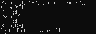 [:2]처럼 첫 인덱스를 생략하면 처음부터 슬라이싱, [0:]처럼 마지막 인덱스를 생략하면 지정한 지점부터 끝까지 슬라이싱한다. 마지막 인덱스는 슬라이싱된 값에 포함되지 않는다. => 모두 문자열에서의 슬라이싱과 동일하다.