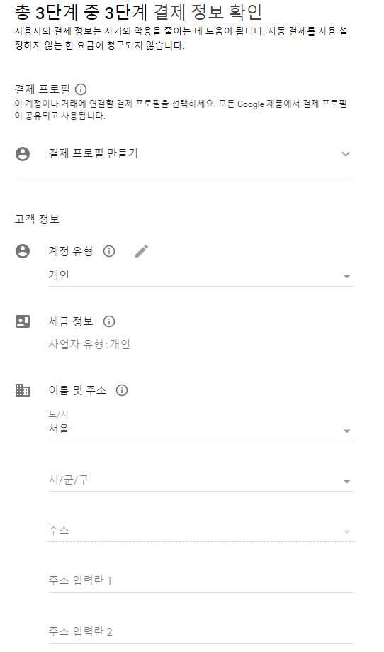 3. 3단계(결제 정보 확인) : 결제 프로필이 만들어져있지 않다면 결제 프로필을 만든다. 계정 유형을 선택하고, 주소, 이름과 우편번호까지 입력한다. 이후, 추가 인증이 있을 수 있으며, 결제 카드도 입력해야 한다.
