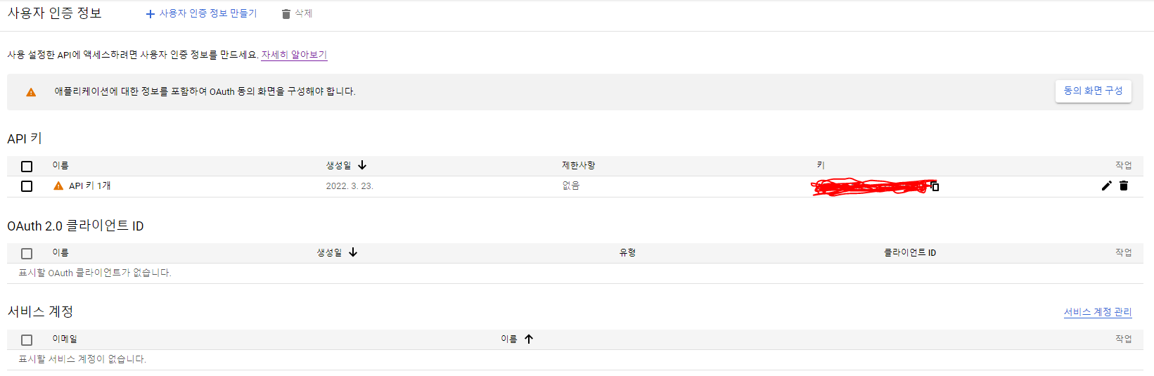 다음부터는 <API key> 발급을 위한 과정이다. 구글 클라우드 플랫폼에서 제공하는 API를 사용하기 위해서 꼭꼭 필요한 과정이다.